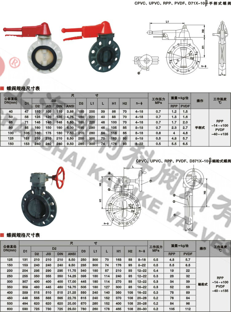 D71X-10S塑料蝶閥适用于帶腐蝕性介質的輸送過程的截流,根據不同材質溫度-14℃~100℃、-40℃~140℃。密封圈采用F4。耐腐性能優異,延長使用壽命。轉動靈活、使用方便。整體式球閥洩漏點少,強度高,裝拆方便。含硬顆粒液體容易使球表面劃傷。全部零件采用FRPP、PVDF、CPVC、UPVC、PVC、RPP 、ABS注塑件組裝成型,耐腐蝕性能優良。
